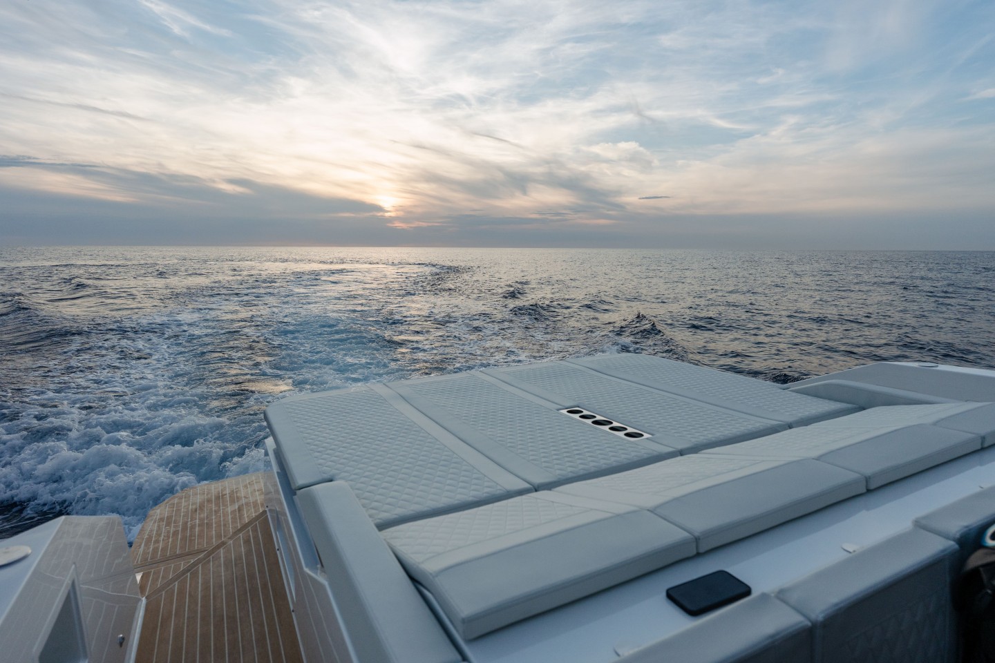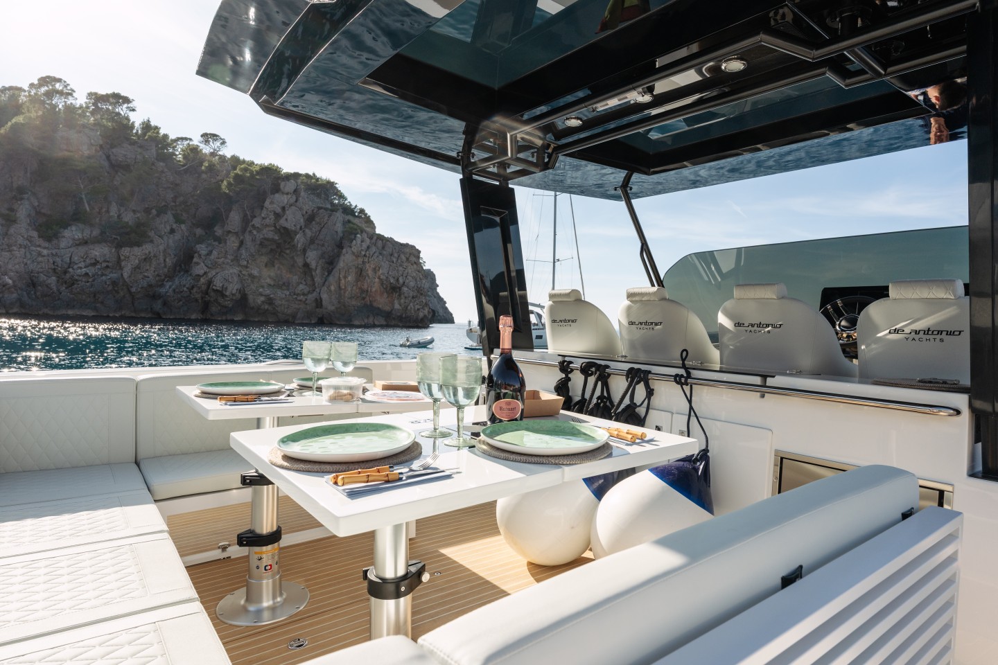 The De Antonio captivates with its modern, sleek aesthetic. Featuring a walk-around layout with no visual barriers, it offers a seamless connection between interior and exterior spaces. Its V-shaped hull ensures smooth sailing even in choppy seas, while its powerful engines provide a fast and dynamic experience.
